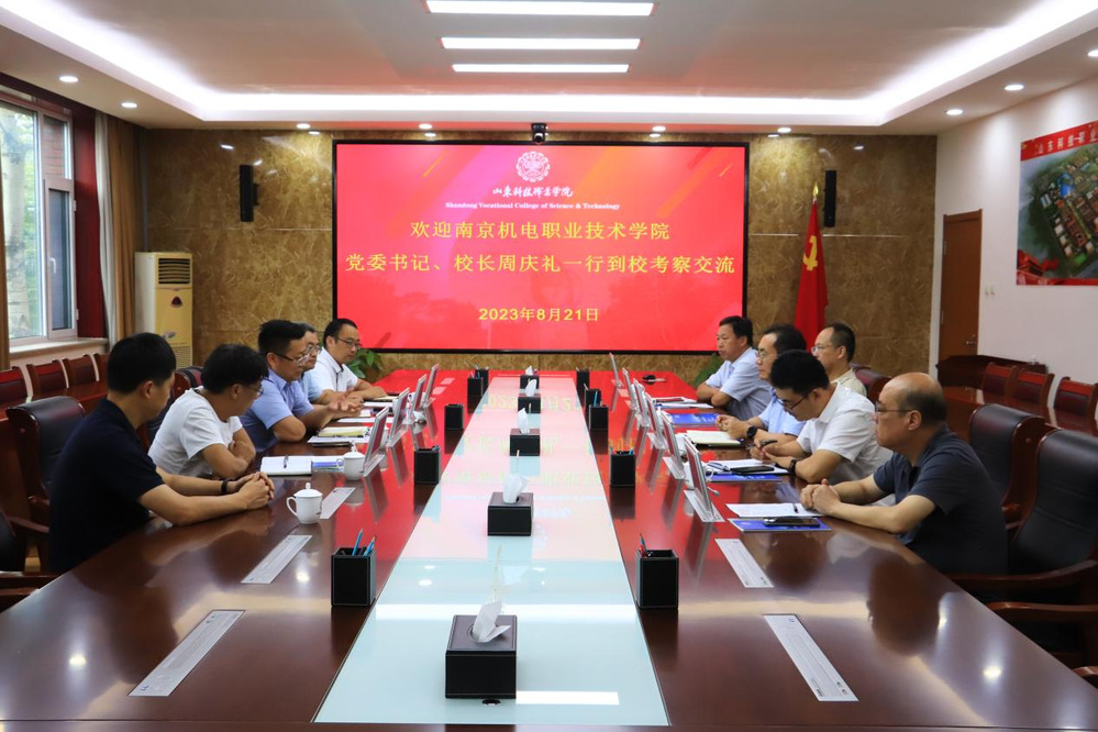 考察组与山东科技职业学院党委副书记、院长刘福玉、党委办公室主任李兴凯、教务处处长张振东、科研与专利管理中心主任王晓卫、机电工程系主任沈铁宏进行了座谈。