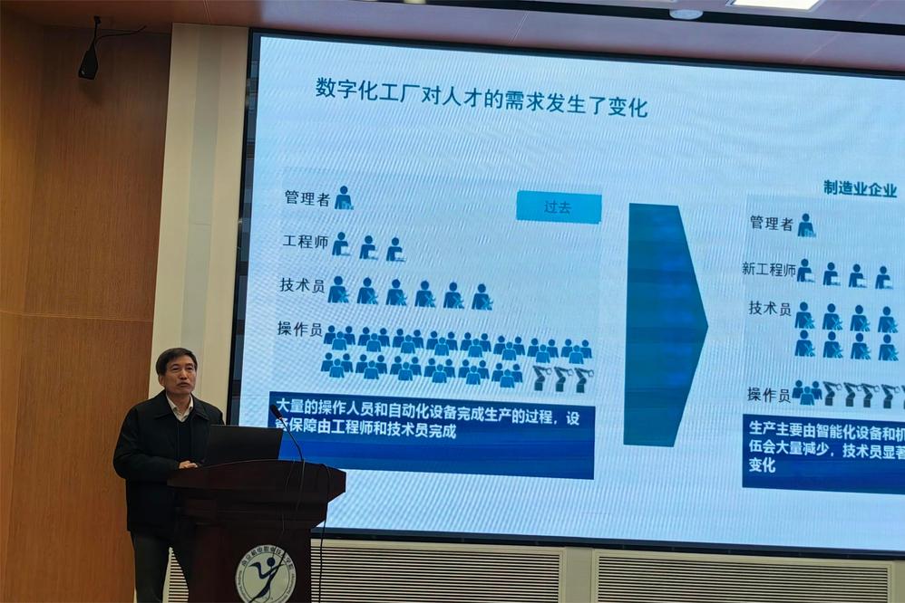 董丙武从制造业工厂向智能制造的转型谈起,详细分析了国内外制造业发展趋势,阐述了数字化工厂对人才需求已经悄然改变,现在的生产已经由需要大量的操作人员和自动化设备完成转变为由智能化设备和机器人完成,操作人员队伍会大量减少,而技术人员将显著增加,工程师结构也将变化。他指出,人力不等于人力资源,智能制造将重新定义职业发展所需要的技术和能力,软件虚拟系统与现实制造的融合将贯穿整个生产和客户服务价值链,专业的职业素养、软件技能、电气自动化技能、机械与结构技能等能力对人才培养提出更高要求。