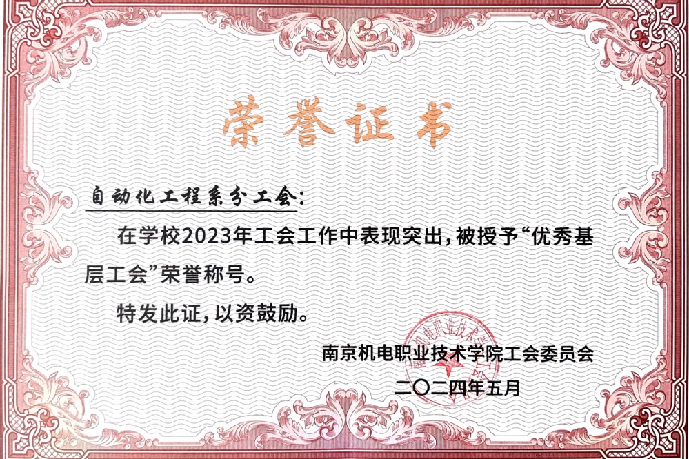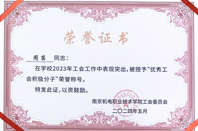 日前,学校工会委员会公布了《2023年度“优秀基层工会”“优秀工会干部”和“优秀工会积极分子”评选结果》,自动化工程系分工会喜获2023年度乐玩体育优秀基层工会组织,周笛被评为2023年度乐玩体育优秀工会积极分子。
