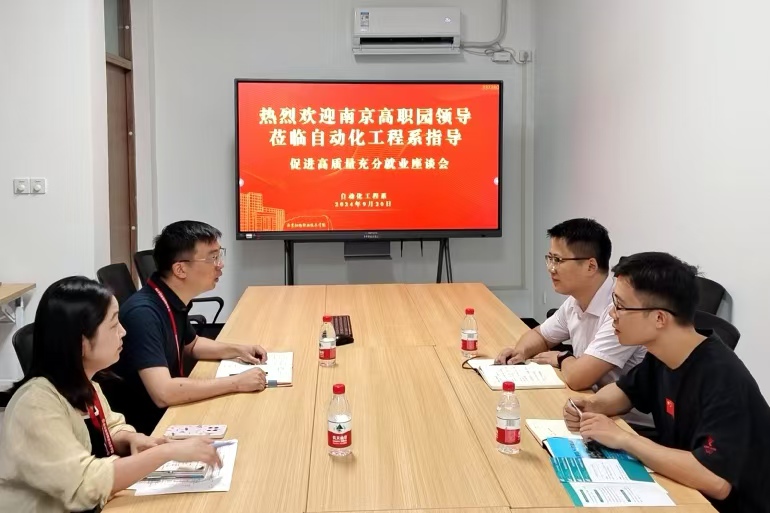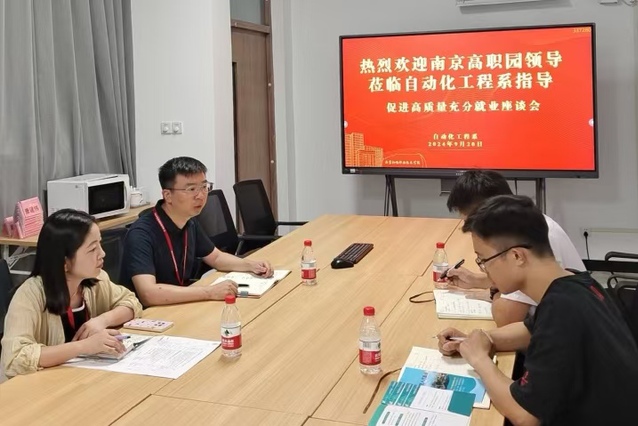 习近平总书记在二十届中共中央政治局第十四次集体学习时强调:“促进高质量充分就业,是新时代新征程就业工作的新定位、新使命。”为学习贯彻习近平总书记关于“强化就业优先政策,健全就业促进机制,促进高质量充分就业”的重要指示,深化产教融合和校企合作,进一步提升毕业生高质量就业,9月20日,南京高职园管委会综合发展服务中心主任吴凯一行来自动化工程系就促进高质量充分就业工作进行调研座谈,自动化工程系党支部副书记杨军、系就业干事俞青、系团委书记周笛陪同调研座谈。