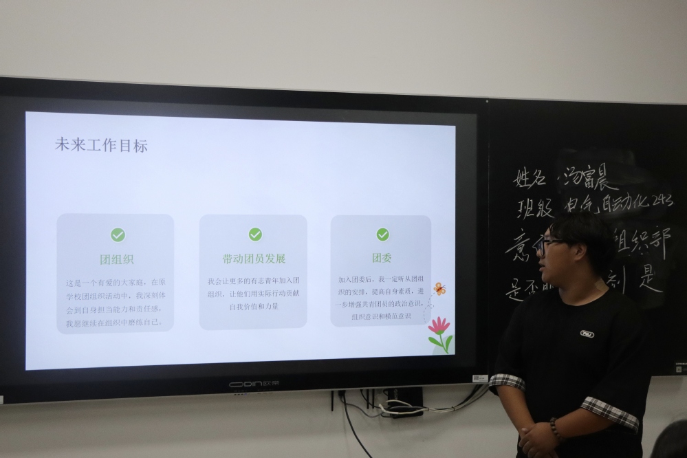翻开人生新篇章,迎接绚丽新体验。为进一步推动自动化工程系团委创新与发展,强化团委团队建设,注入新的活力与希望,9月20日,自动化工程系团委招新干事面试工作在博学楼309正式拉开帷幕。本次面试工作由团委兼职副书记郑梦洁主持,党支部组织委员俞青、团委书记周笛及各部门负责人担任面试官。