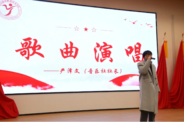 在等待评分的环节中,音乐社社长严泽文带来了音乐演唱表演。