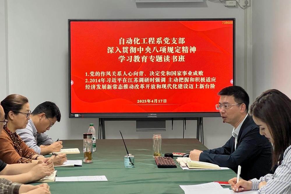 为深入贯彻落实党的二十届三中全会和中央八项规定精神学习教育部署,巩固拓展学习贯彻习近平新时代中国特色社会主义思想主题教育成果,巩固党纪学习教育成果,深化作风建设实效,4月17日,自动化工程系党支部在敏行楼405会议室开展深入贯彻中央八项规定精神学习教育读书班集中学习。系党支部副书记杨军、副主任张海红、副主任顾晟吉和支委会全体成员、专业负责人参加集中学习。