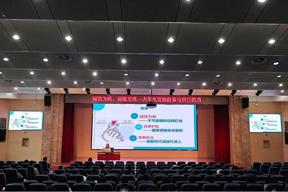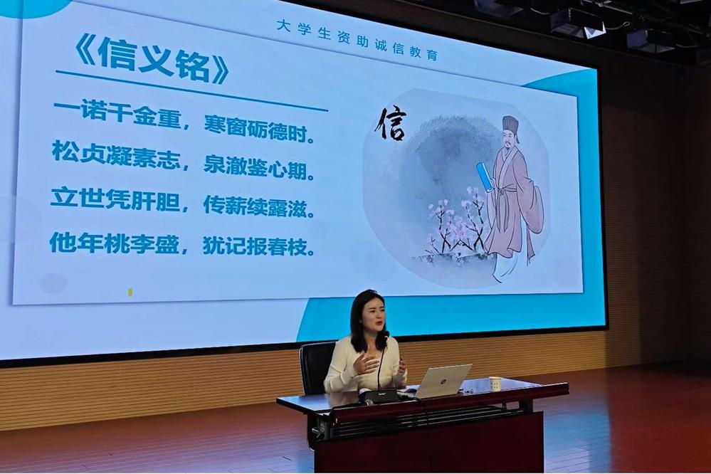 当日下午,于靖欢在南京信息职业技术学院礼堂作“诚信为帆、远航无忧——大学生资助政策”专题讲座。通过政策解读、案例分析、互动问答等形式,系统讲解了国家助学贷款、奖助学金评审及征信知识,引导学生在践行诚信中筑牢成长基石。学生在讲座后表示:“讲座让我更清楚如何申请资助,也明白了诚信是做人的根本。”